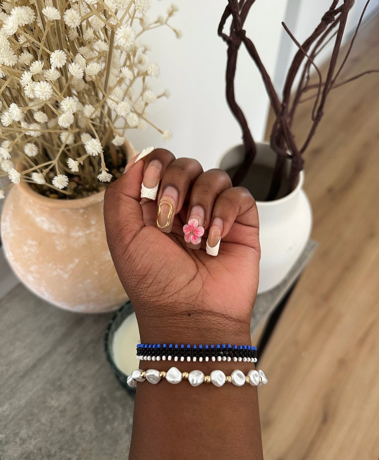 The Estonia Slim Flag Bracelet by AfroCrafted features fine glass beads in the vibrant blue, black, and white colors of the national flag. This thinner design is woven with durable, water-resistant thread, offering a lightweight yet resilient piece.