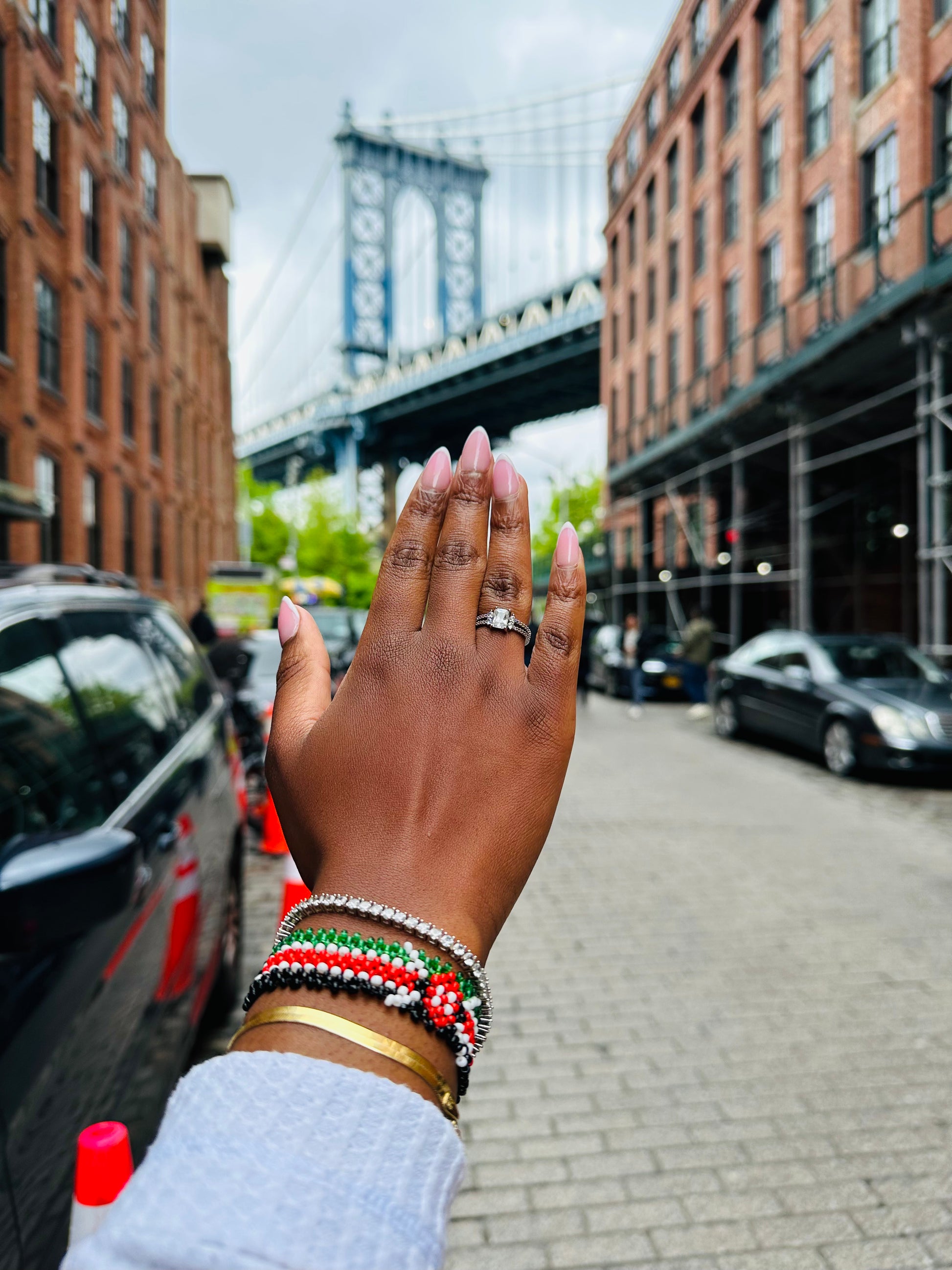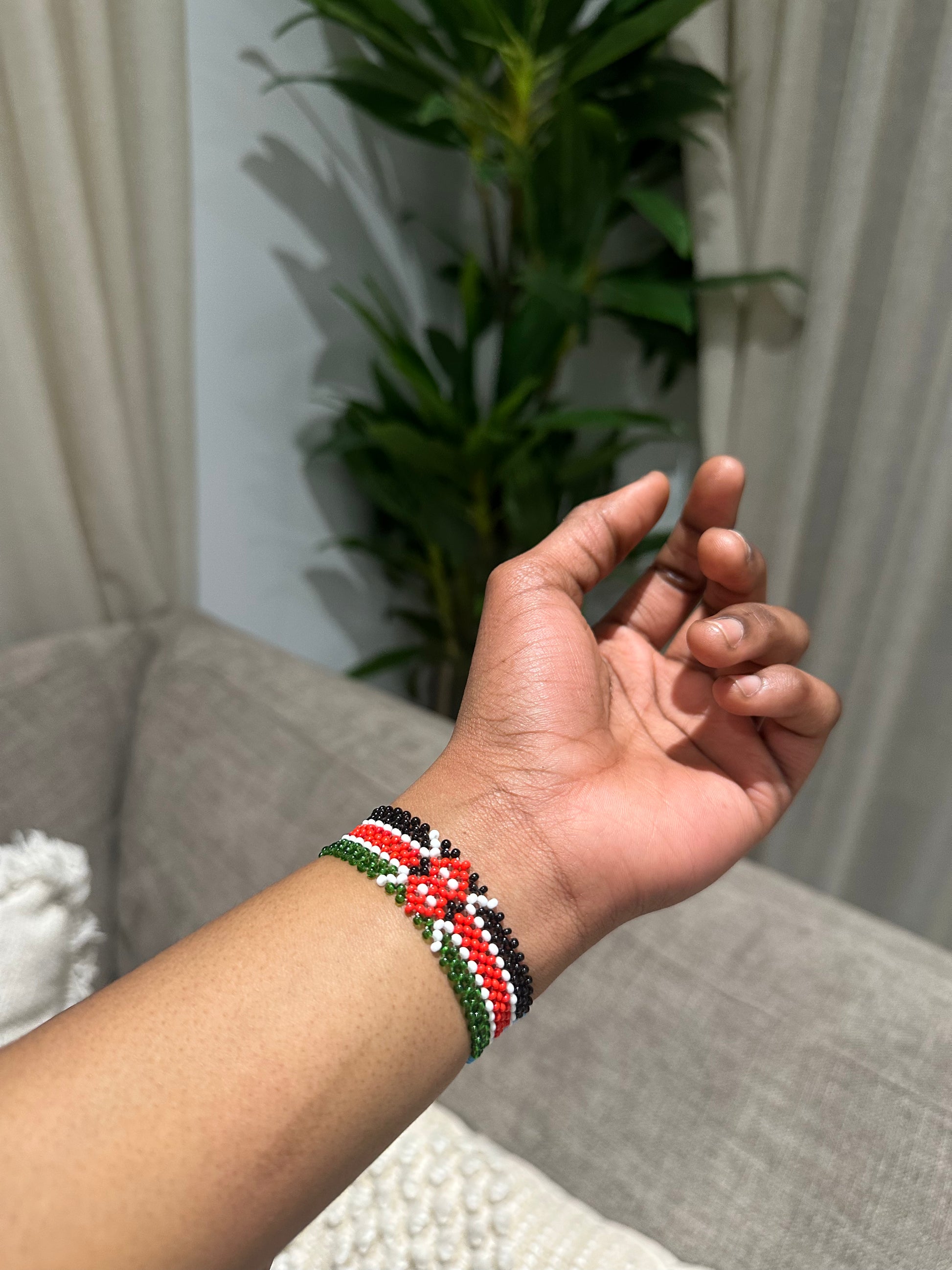 The Kenyan flag bracelet, an Afrocrafted piece, is made with glass beads intricately handwoven to mirror the black, red, green, and white colours of the national flag, including the iconic shield and spears. The thread used in its construction is water-resistant, woven with strong, non-elastic material that ensures durability and resistance to breaking.