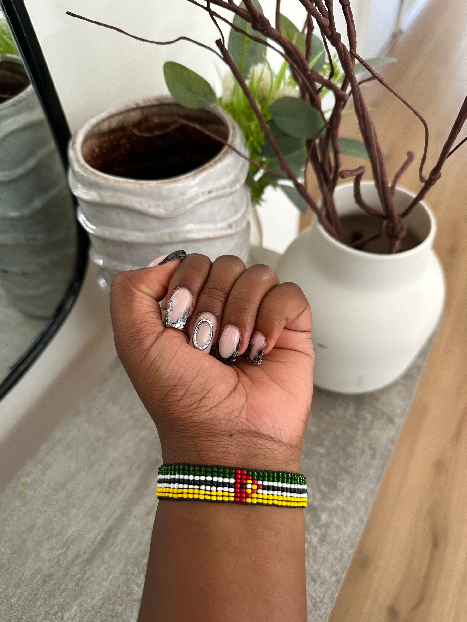 The Mozambique Adjustable Flag Bracelet, an AfroCrafted piece, is made with glass beads intricately handwoven to reflect the bold colors of the Mozambican flag. It features horizontal green, black, and yellow stripes separated by thin white lines, symbolizing the land, the continent, and the country’s wealth. The bracelet is finished with a durable sliding cord that allows for easy size adjustment, ensuring a comfortable and customizable fit. The thread used in its construction is water-resistant, woven with strong, non-elastic material that ensures durability and resistance to breaking.