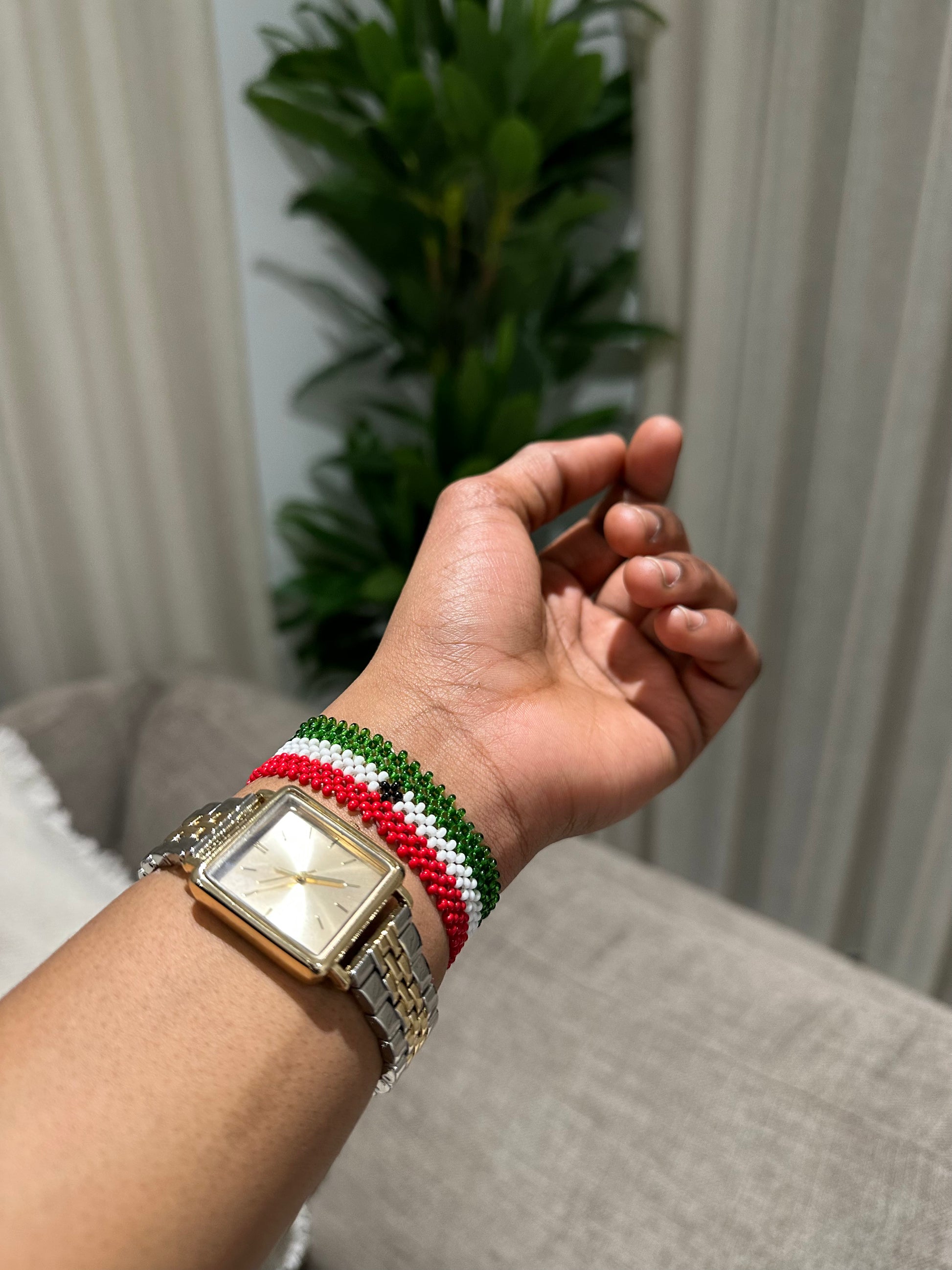 The Somaliland flag bracelet, an Afrocrafted piece, is made with glass beads intricately handwoven to mirror the green, white, red, and black colours of the national flag. The thread used in its construction is water-resistant. It is woven with strong, non-elastic thread that is durable and resistant to breaking.