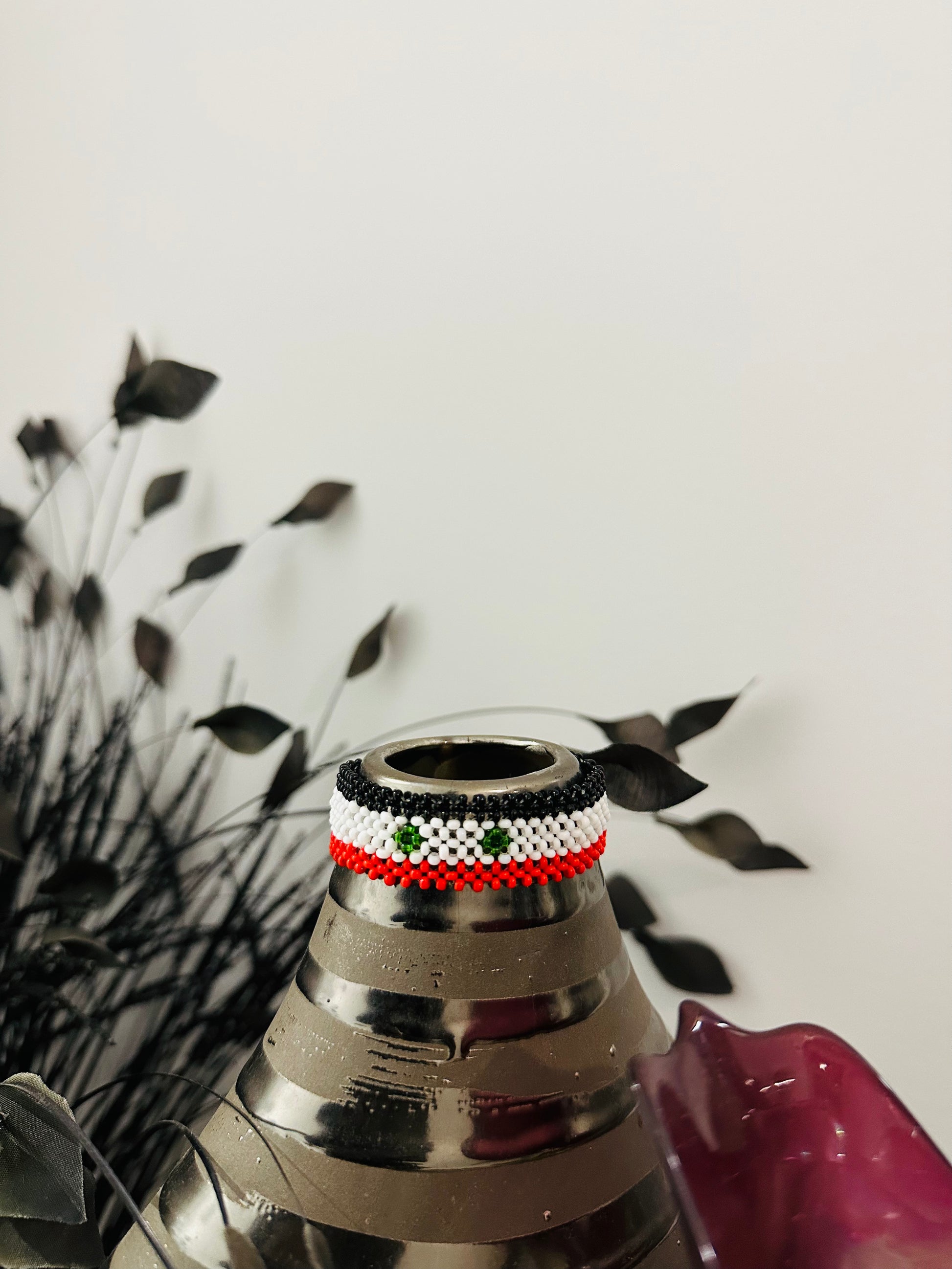 The Syrian flag bracelet, an Afrocrafted piece, is made with glass beads intricately handwoven to mirror the red, white, black, and green colors of the national flag. The thread used in its construction is water-resistant, woven with strong, non-elastic material that ensures durability and resistance to breaking.